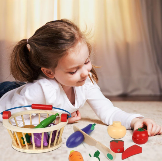 Wooden Magnetic Cutting Vegetables Food Play Toy Set with Basket for Kids