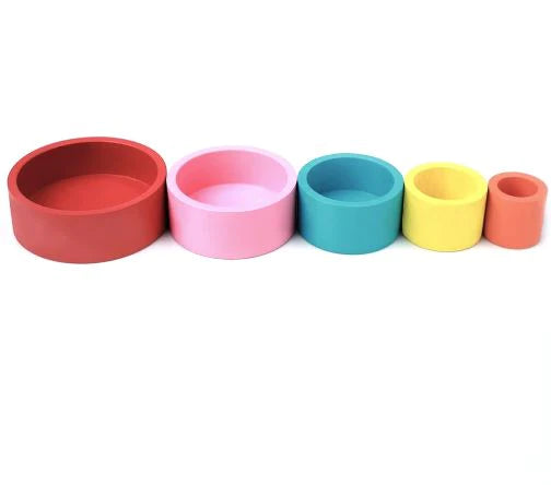 Grasp and release movements are crucial for various developmental aspects. Nesting bowls help your baby explore this. By grasping a bowl and releasing it they are working on Hand-eye coordination which leads to fine motor development. Fine motor development is required to master the usage of tools like pencil, chalks, spoons etc effortlessly