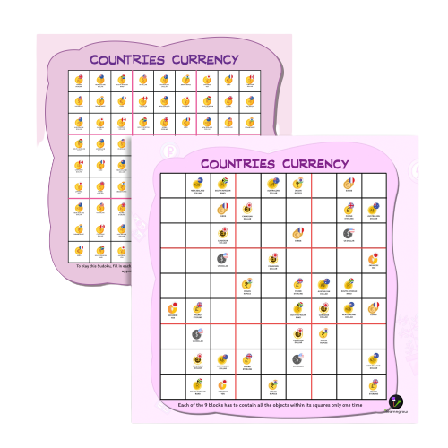 Sudoku is played on a grid of 9 x 9 spaces. Within the rows and columns are 9 “squares”. Each row, column, and square (9 spaces each) needs to be filled out with the countries currency, without repeating any currencies within the row, column, or square