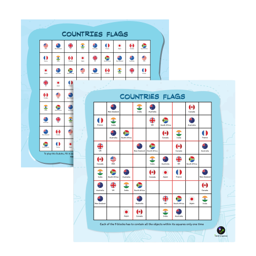 Sudoku is played on a grid of 9 x 9 spaces. Within the rows and columns are 9 “squares”. Each row, column, and square (9 spaces each) needs to be filled out with the country flag, without repeating any flags within the row, column, or square
