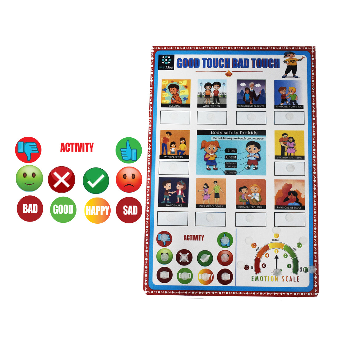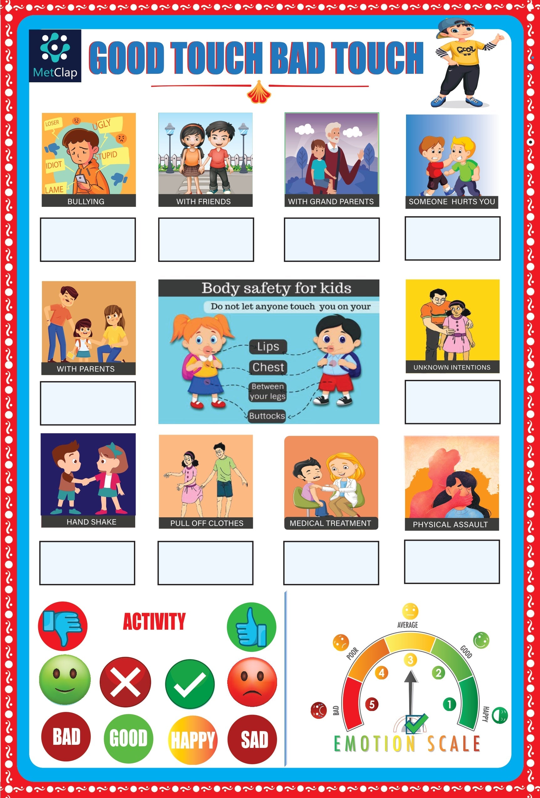 Good Touch Bad Touch Activity Board Game Encourages the Children to Learn and Become Aware of Appropriate and Inappropriate Gestures. This will help them Stay Happy and Safe, especially during their years of Adolescence. "Good Touch”, is a way for people to show they care for each other and help each other (i.e., hugging, holding hands, such as hugs from family, a pat on the back, or shaking hands). “Bad touch”, on the other hand, is the kind you don't like and want it to stop right away (e.g. hitting, kicking, or touching private parts).