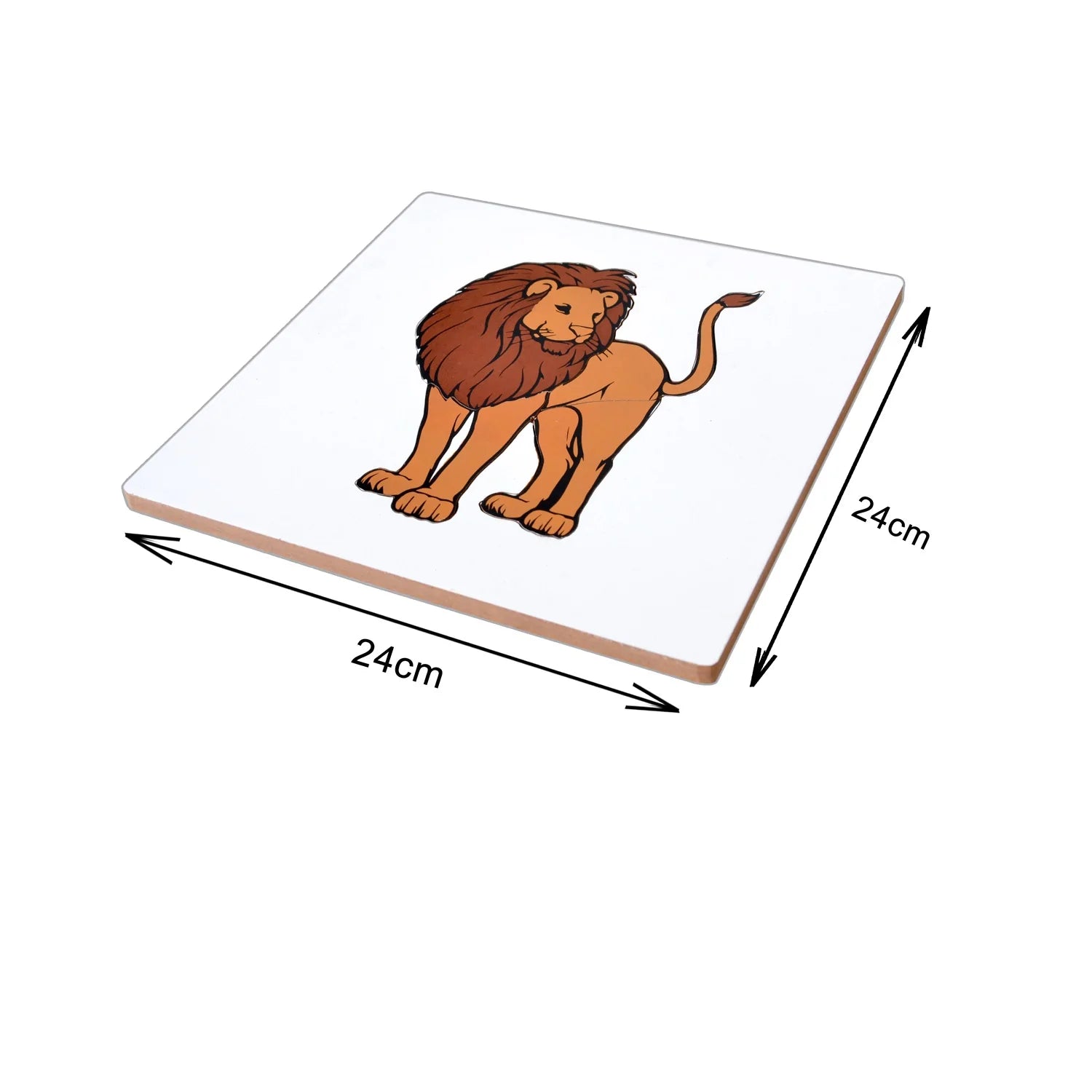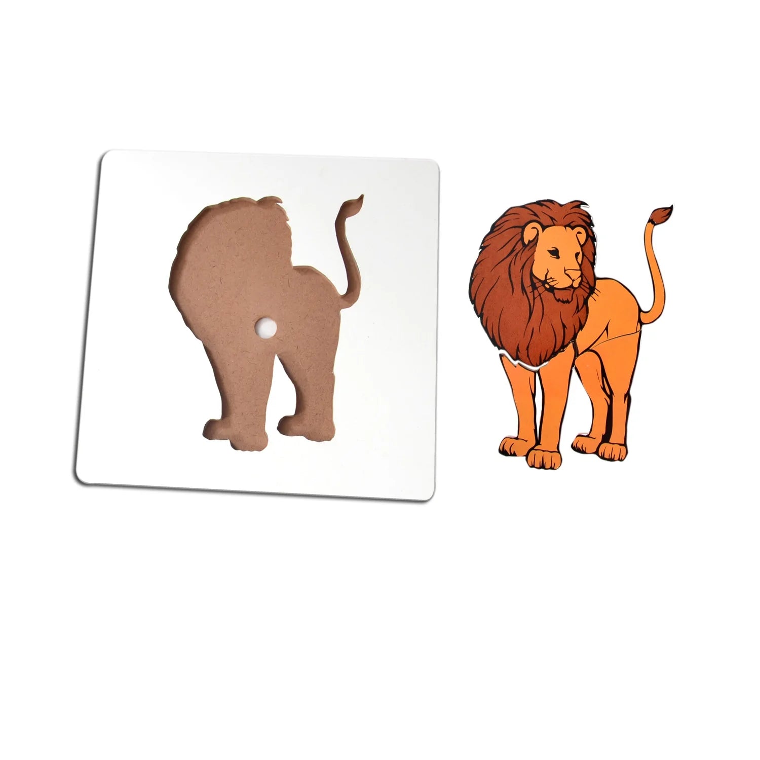 The lion puzzle is made out of MDF wood, and it has been cut into 4-5 pieces. It improves the logical thinking of the children and also develops the left part of the brain of the child, these puzzles are colored with ECO-Friendly paints and are knobless. There is a hole backside to push and remove the puzzle parts. The child needs to then assemble all puzzle parts using his fingers.