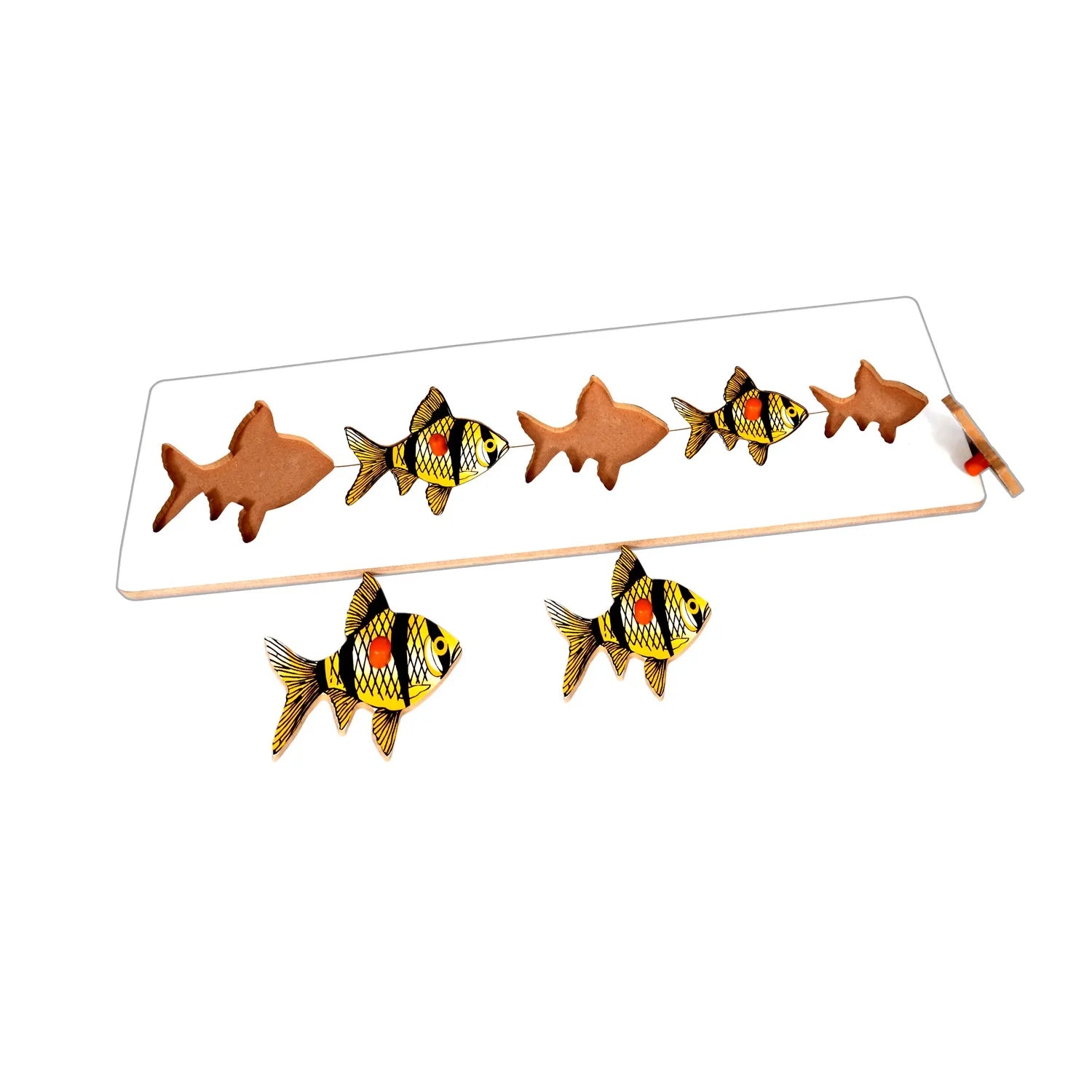 • A beautifully finished wooden puzzle depicting fish of different sizes with a knob for the child to hold