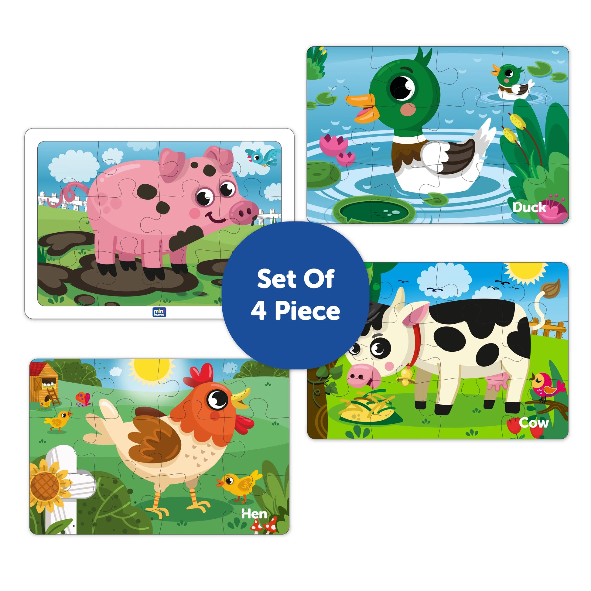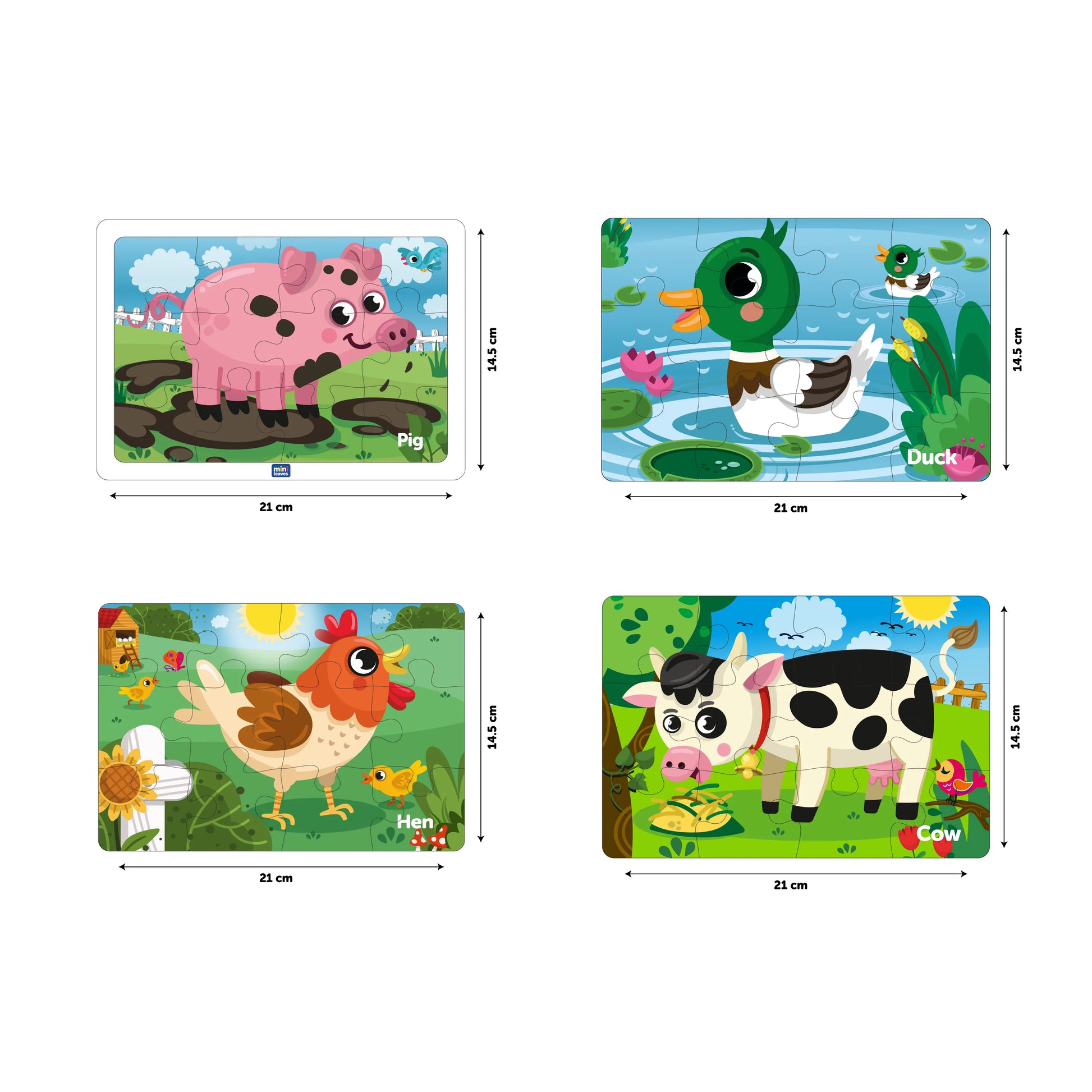 My Farm 4 In-1 Wooden Puzzle Features 4 Farm Animals Includes Cow, Duck, Pig, and Hen. It Comes with a 12 Piece Jigsaw Puzzle in 1 Wooden Puzzle Set in a Wooden Tray. Tray makes it easy for kids to make the puzzle and store it. Each puzzle piece is shape-coded on the back for easy sorting. Great for travel!