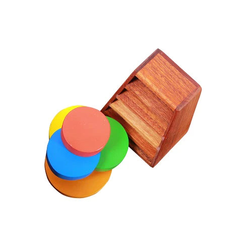 This is a great puzzle to learn size discrimination, colors, and sequencing. The puzzle consists of five brightly colored discs, in five different sizes, for the child to place into a wooden tower.