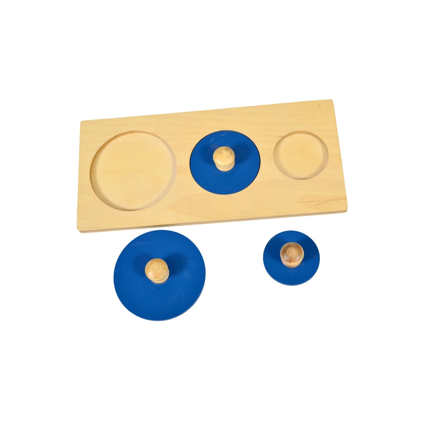 The puzzle board provides an introduction to different sizes where the same shape (circle) varies in sizes in the same board. The knobs are big to make the child easier to hold.