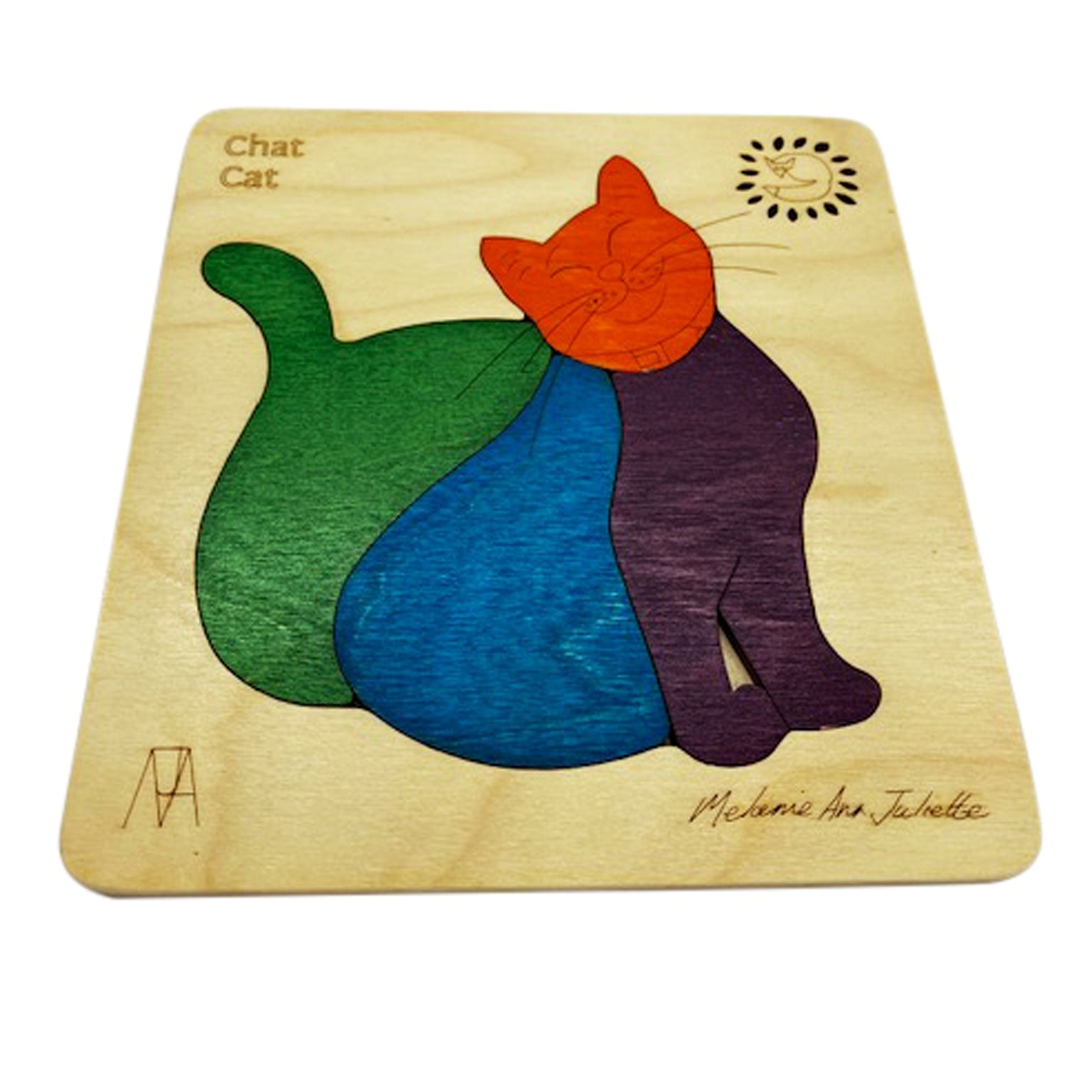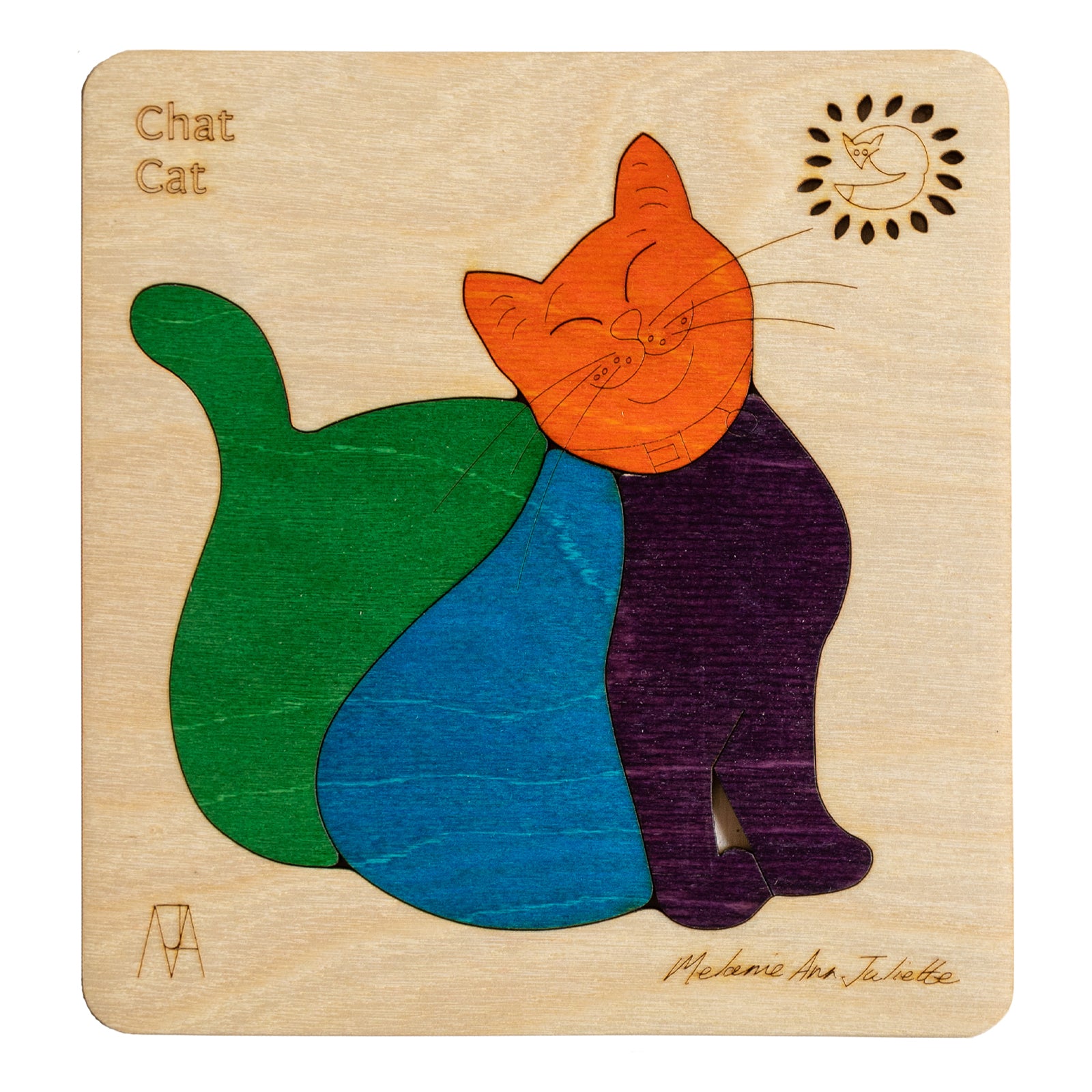 The Wooden Chat Cat Puzzle Board helps the Child to Learn Puzzling Skills and Learn About Cats. Chat Cat is a Smiley-Faced Cat Which Teaches a Child to Love and Care for Animals.