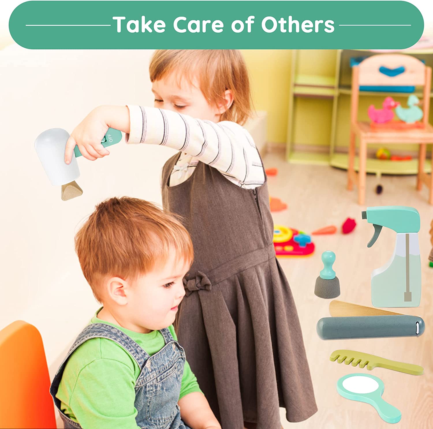 Wooden Comb & Shine Kids Hair Salon Playset Develop Their Children's Self-Care Ability. This Toy Stimulates Hairdressing to Let Babies Know How to Take Care of Themselves and Others, Developing a Confident and Independent Character in the Hands-on-process.