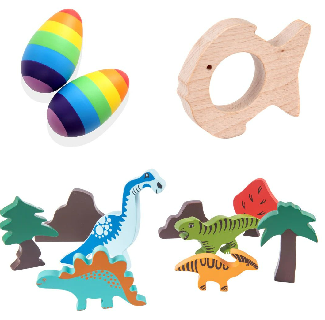 Wooden Dinosaur, Blocks, Egg Shaker (Rattle) & Teether - Combo