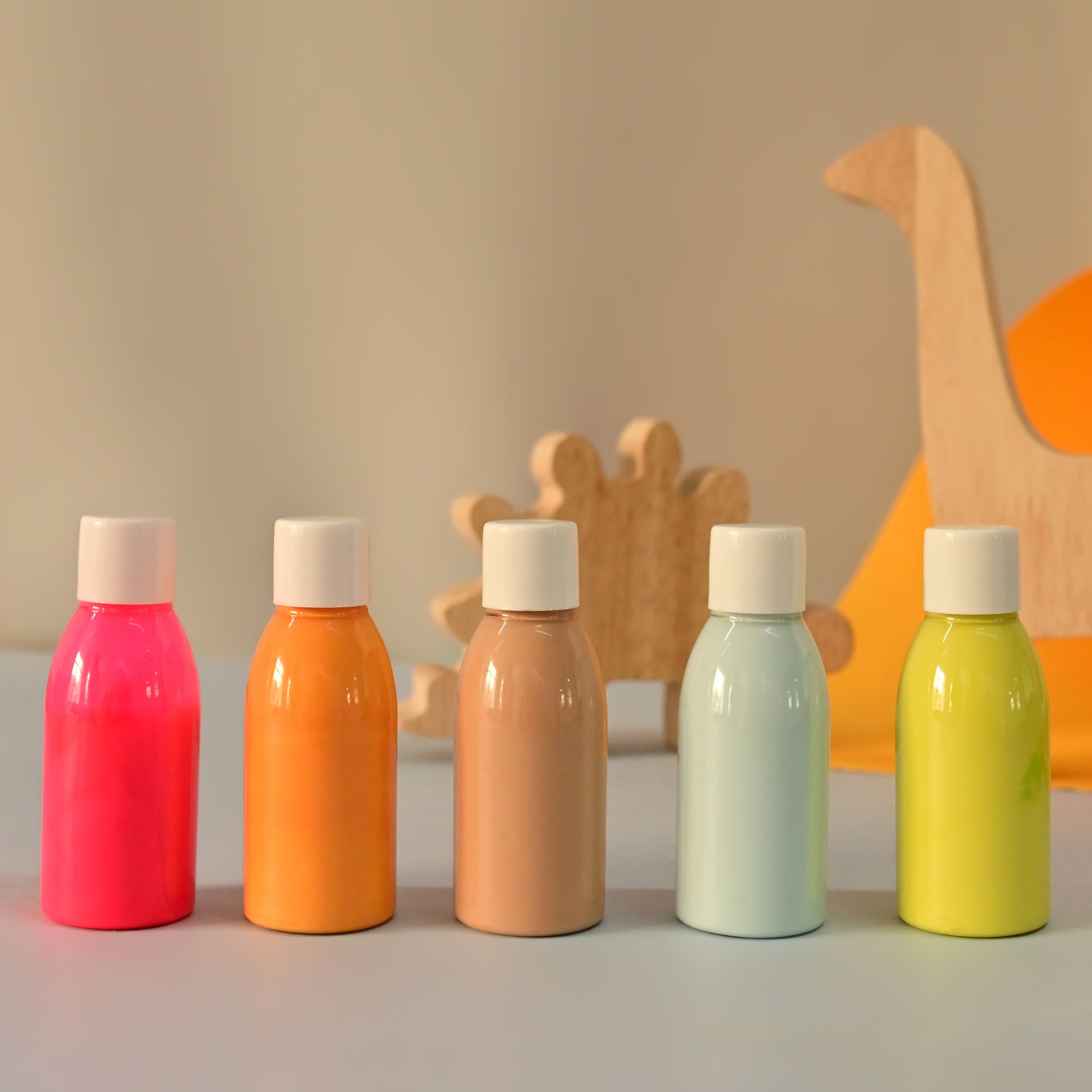 2 Dinosaurs, 5 Colour Bottles, 2 Paint Brush and 2 Sponge Brush.