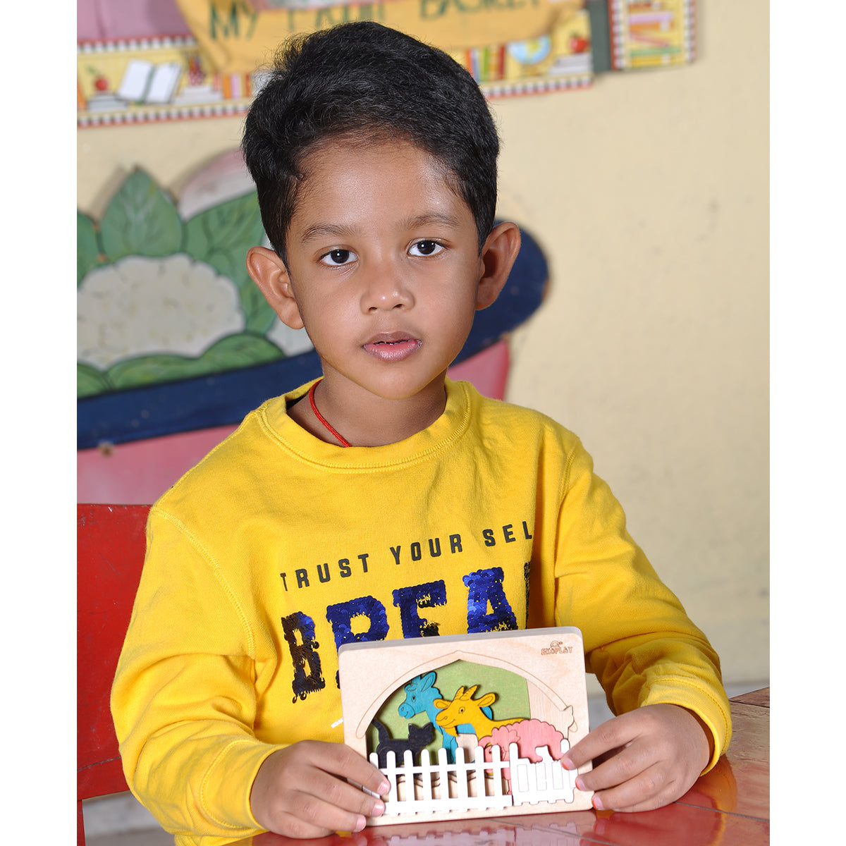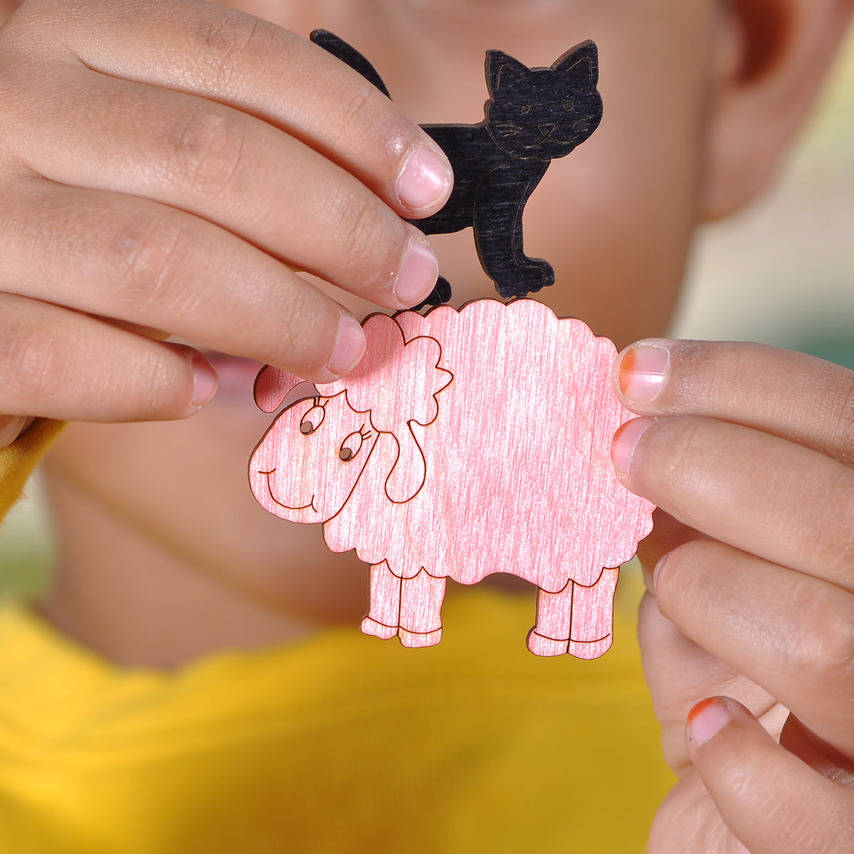 Wooden Farm Animal Puzzle Board Consists of Farm Animals which include Pony, Goat, and Sheep that are Grazing. This Puzzle is Focused on Improving the Developmental Journey of Children through Meaningful Play.