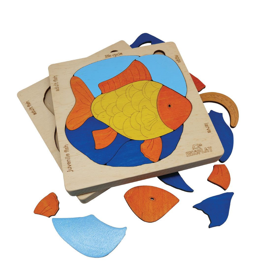 Depicted through an educational yet fun 4 layer puzzle. (Egg, Larva, Juvenile Fish, and Adult Fish)
