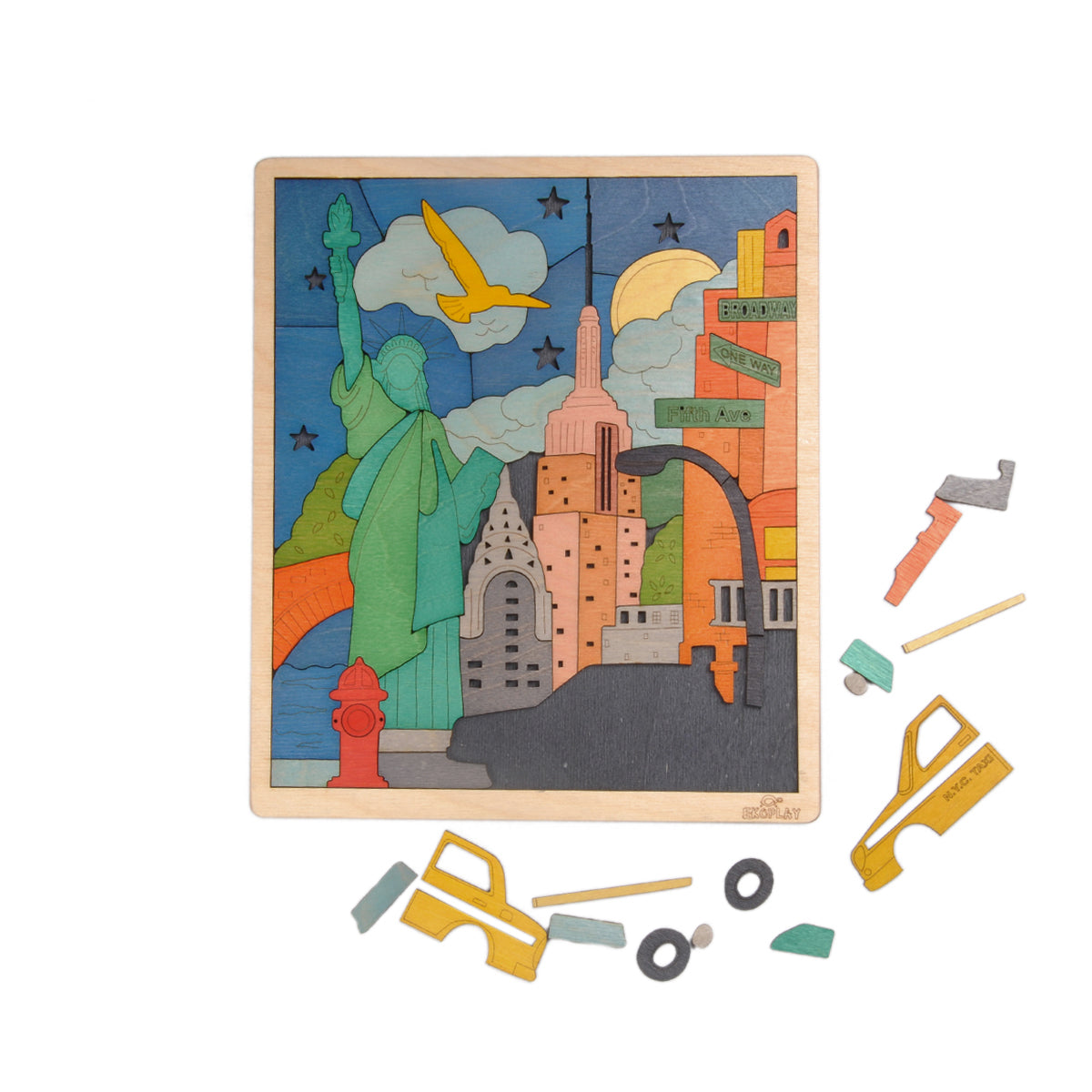 The Wooden New York Puzzle Board Depicts the Greatest Cities in the World. This Puzzle helps the Child by putting together the Puzzle Pieces of the Statue of Liberty, the Empire State Building, the Brooklyn Bridge, the Red Fire Hydrant, and The NYC Yellow Taxi.