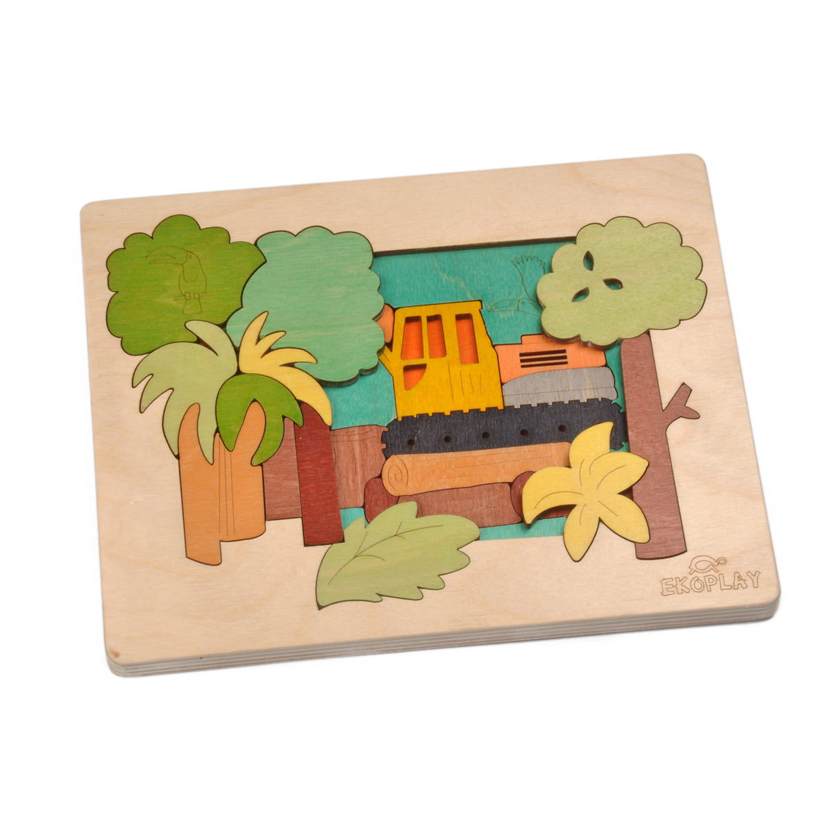 Wooden Rain Forest Demolition Puzzle Board Helps the Child Understand the Pros and Cons of Construction Work and Will allow them to Learn to Think about how their Surroundings are Created and Create an Impact on Nature.
