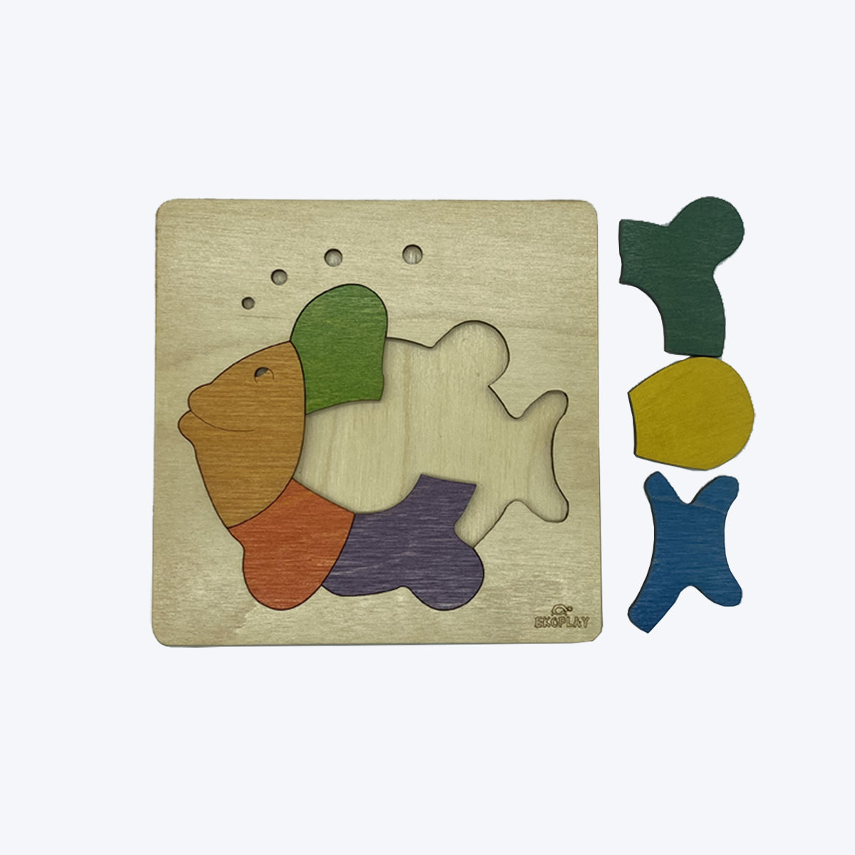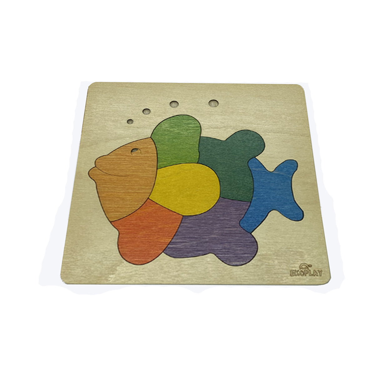The Wooden Rainbow Fish Puzzle Board depicts the Fish Puzzle. This Puzzle improves Children's Spatial Activity and Creativity.