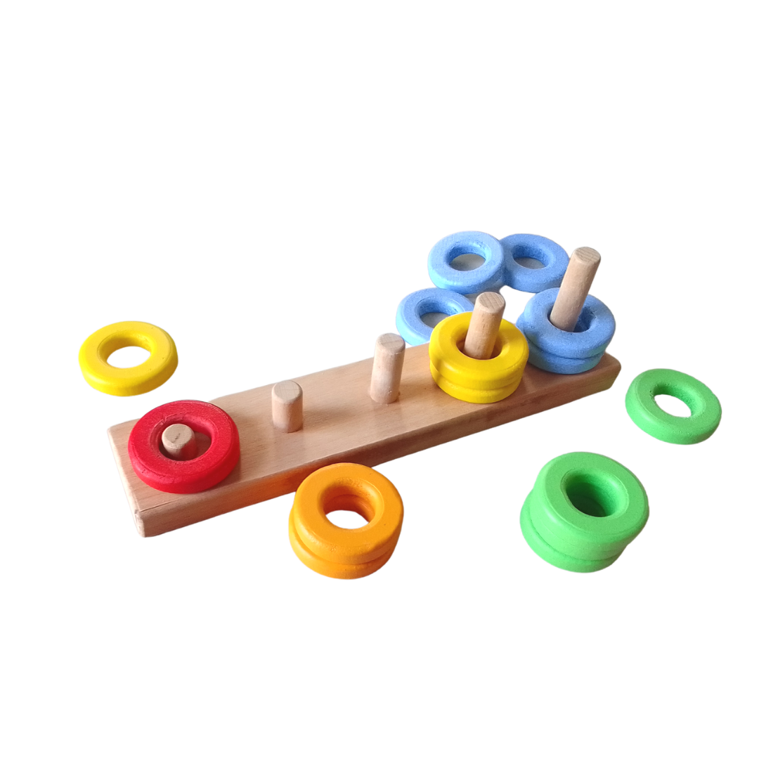 This wooden toy set contains different circular rings of different colors. Parents have to first help kids arrange the rings according to the color one above the other. It will help them identify the colors of the rings and they will learn counting while stacking the rings.