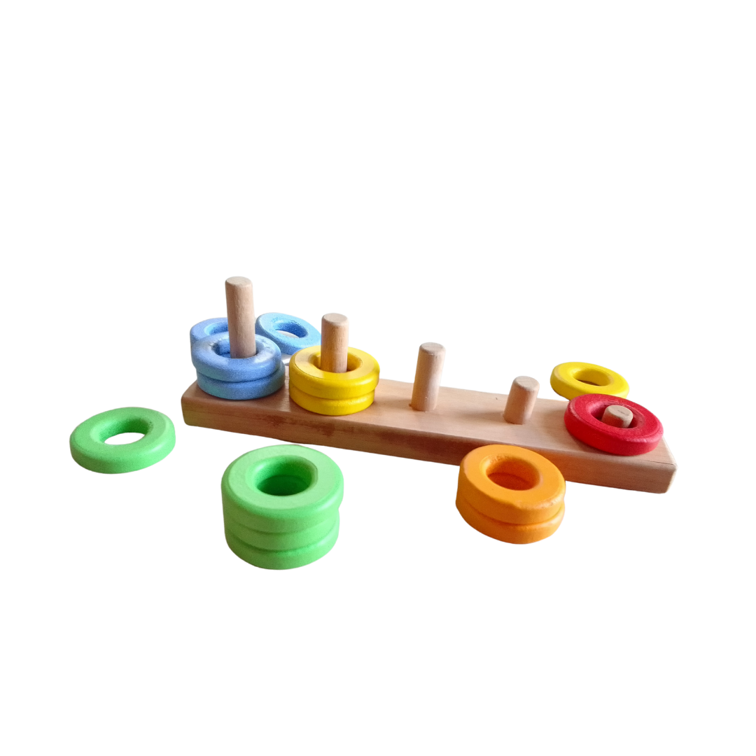 Ring stacker toy contains a wooden board with five pegs and circle shape rings, which kids have to arrange in pegs. It will be fun and exciting for them to add the right ring to the pegs. All rings are of different colors without any sharp edges.