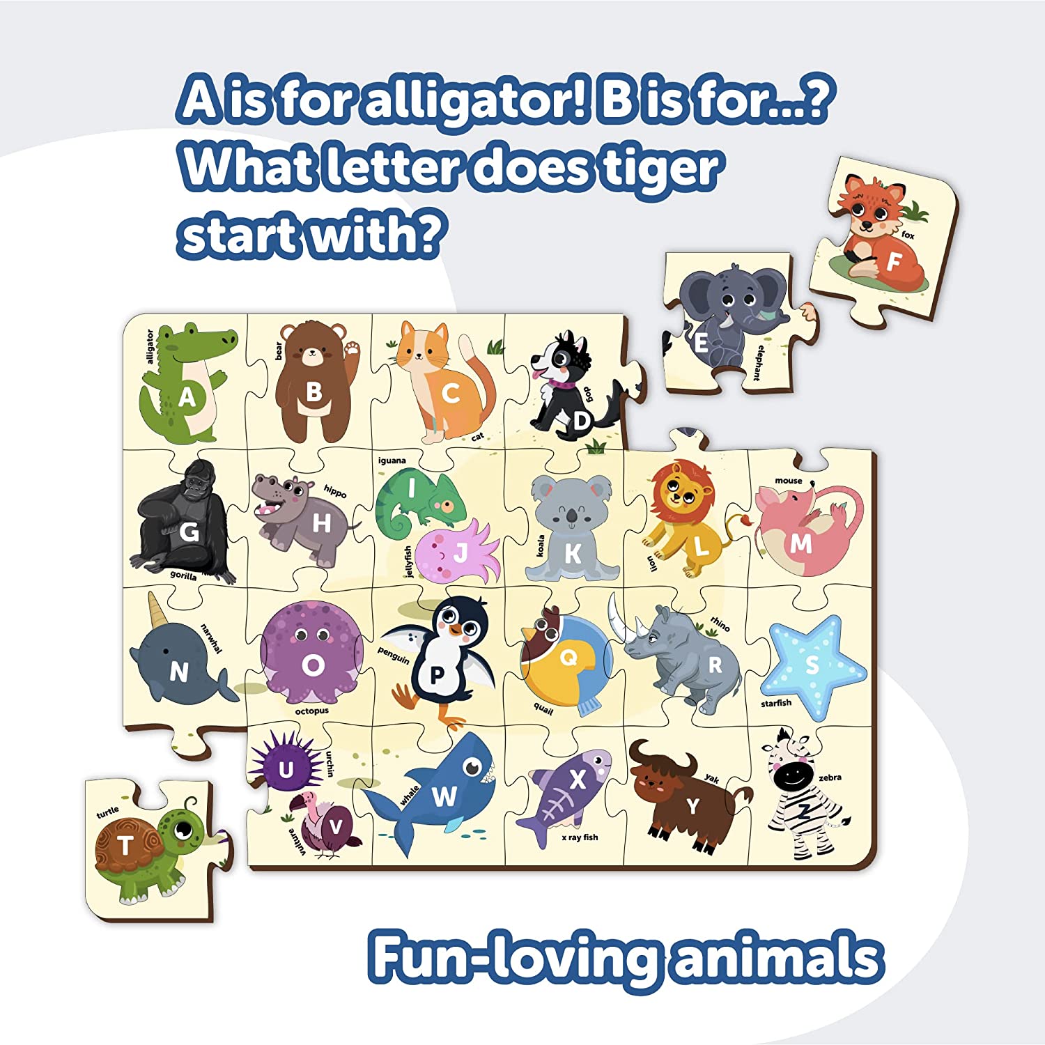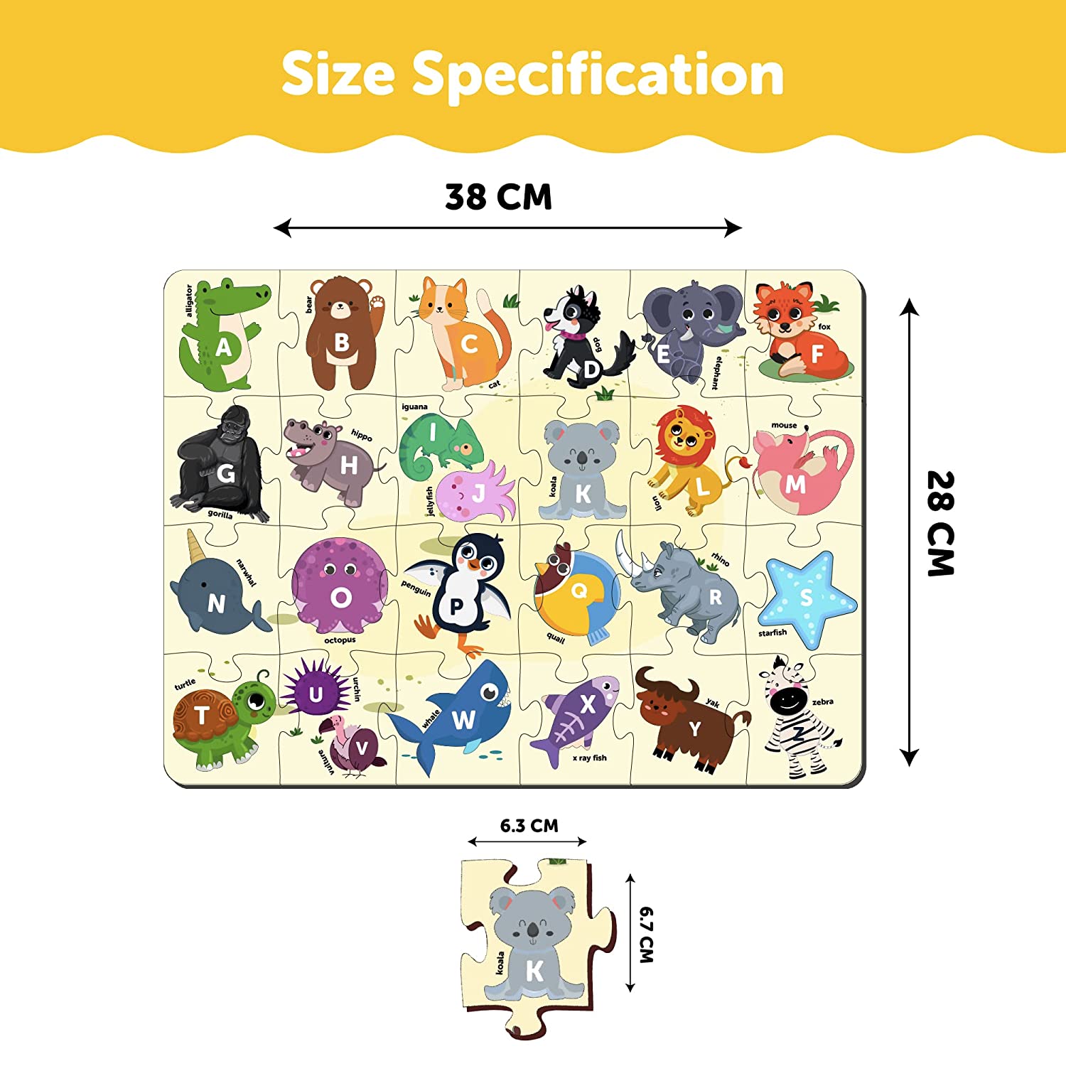 The Wooden Spell And Learn Alphabets Learning Puzzle Helps the Kids Learn the Alphabet with the Animal's Spelling Names of Animals. The Kids Learn to Recognize the Animals and Assemble the 26 Pieces of Puzzle.