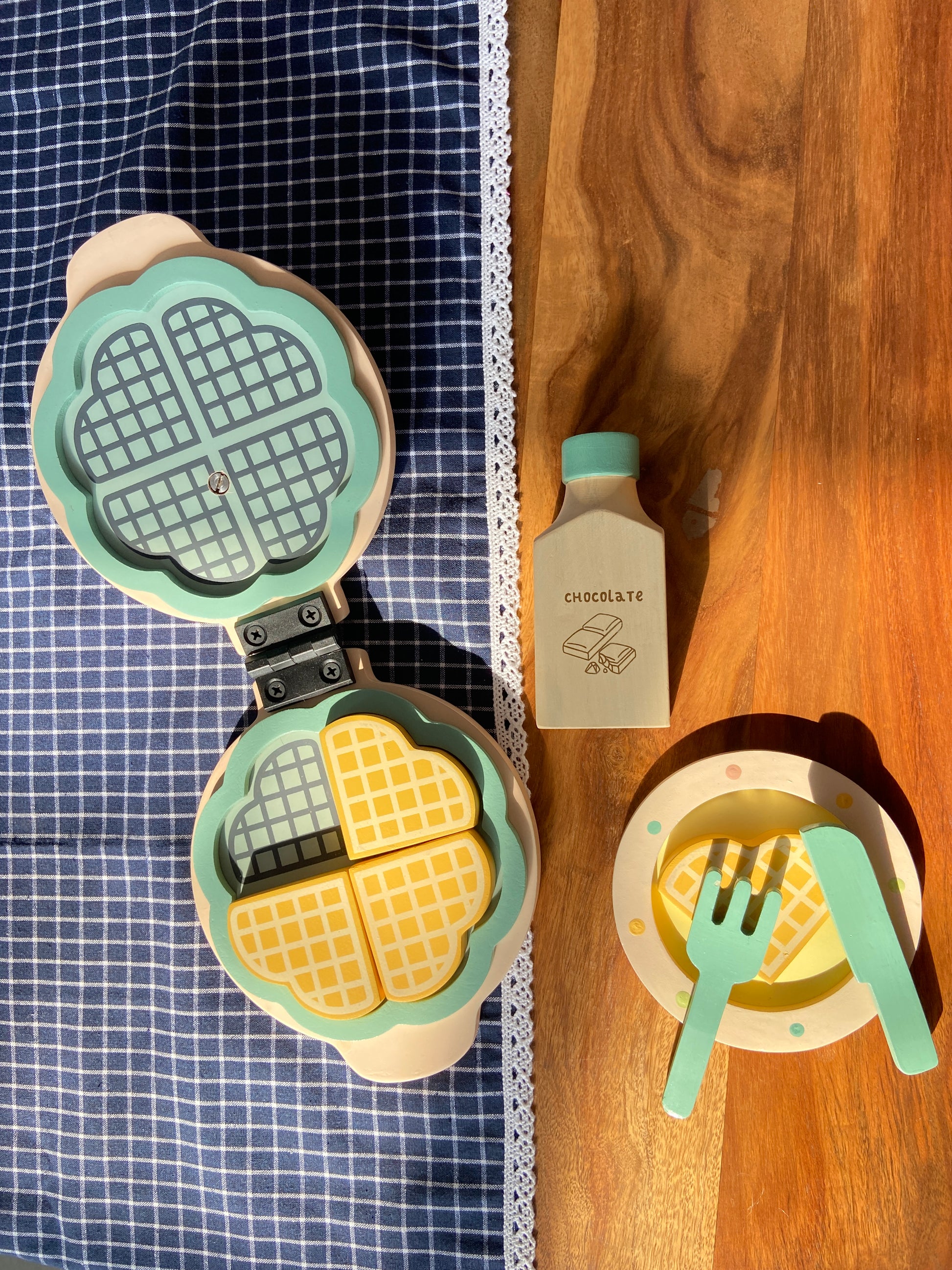 1 waffle maker, 4 waffles, 1 fork, 1 Knife, 1 plate and 1 pretend bottle of chocolate syrup.